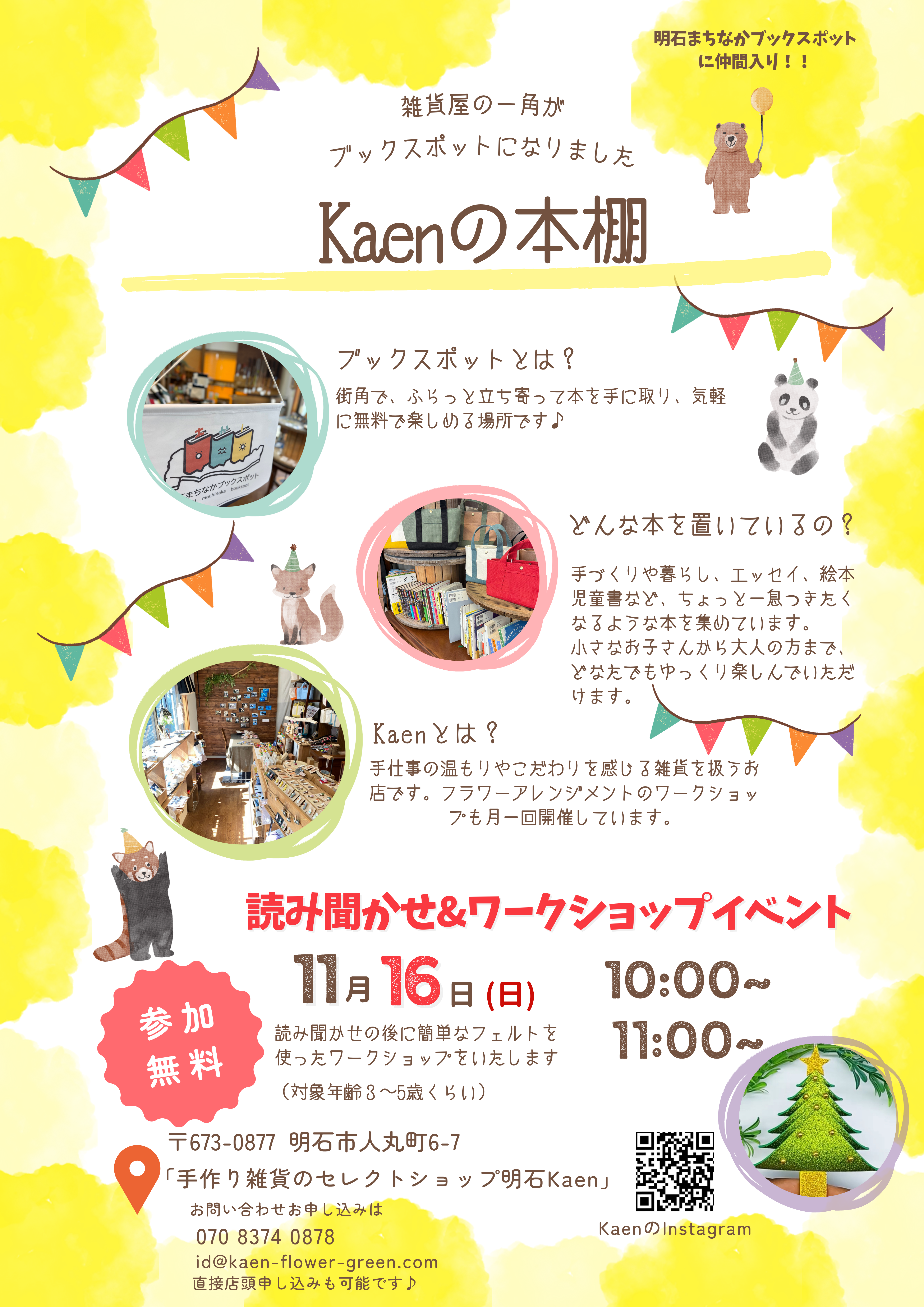 明石の雑貨屋Kaenでは、明石の取り組み「まちなかブックスポット」に登録し、第一回読み聞かせの会を開催します